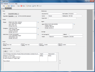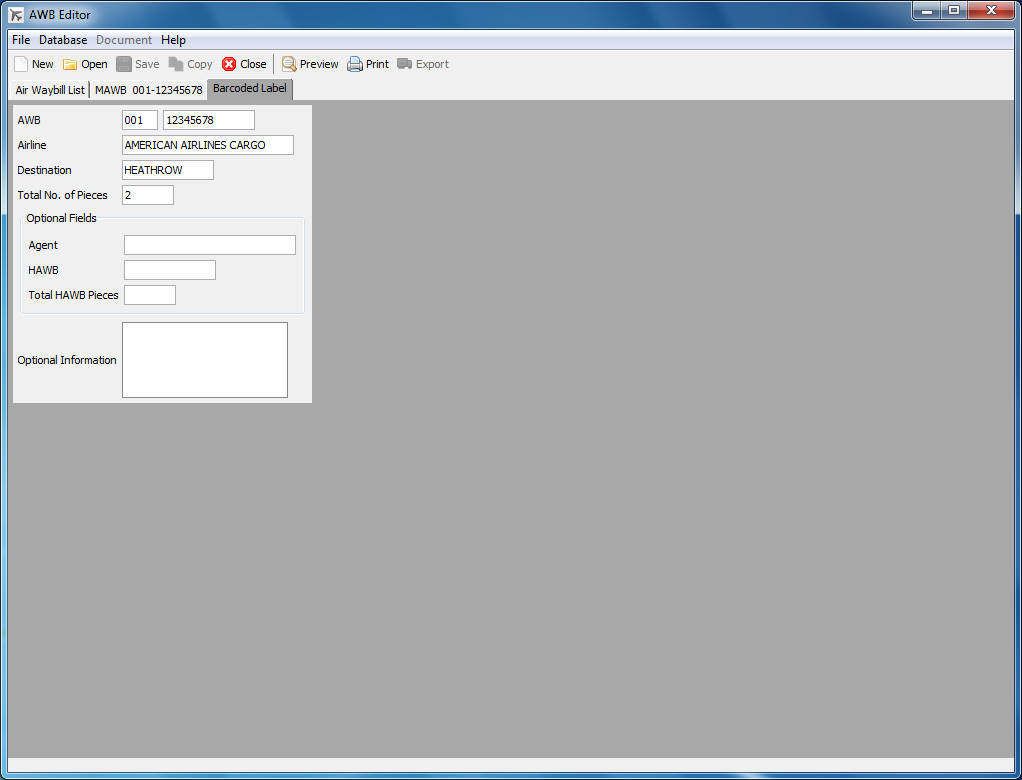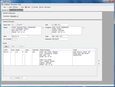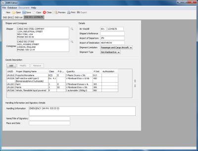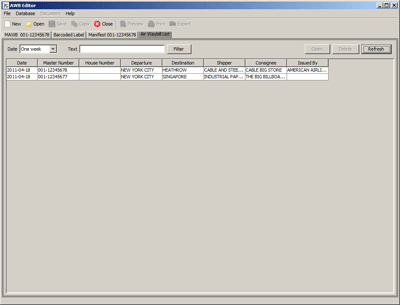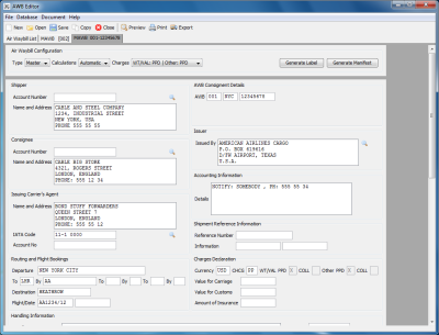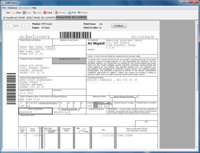 Screenshots: Air Waybill Form Manifest Form Bill of Landing Air Waybill Print Preview eAWB/FWB DGD Preview Barcoded Label Form Dangerous Goods AWB Database
